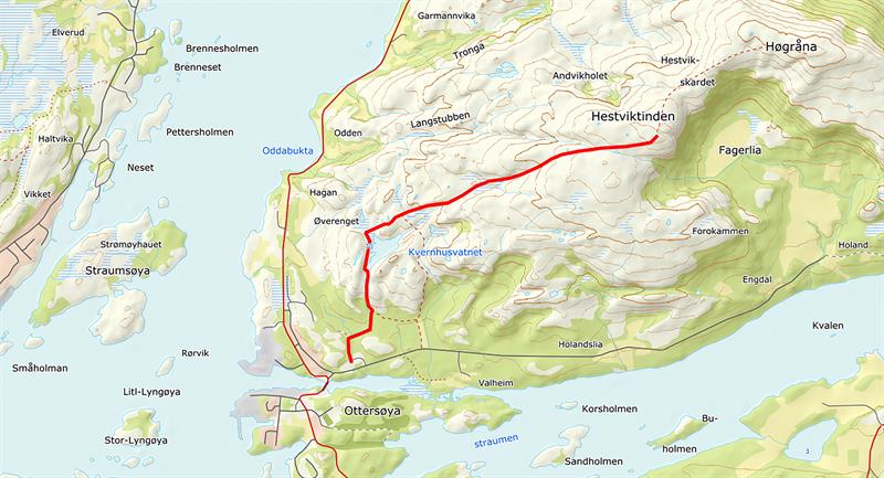 Turen starter ved forsamlingshuset Fjellvang, og etter 5 - 10 minutter langs en skogsveg kommer du til en gapahuk. Fra gapahuken er det en kort oppstigning til Kvernhusdammen. Kvernhusdammen ble demmet opp for å sikre vannforsyning til befolkningen i Ottersøy. Fra Fjellvang bruker du cirka en time opp til Hestviktinden, og du kan nyte utsikten undervegs og oppe på toppen. Fra toppen kan en også gå videre til Høgråna 328 moh.