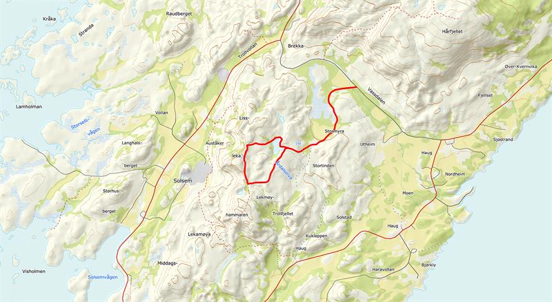 Følg driftsvegen 1 km til grustak i Stormyra, og merket sti opp til idylliske Longvatnet. Gå runden mot sola og følg stien opp på Storfjellet med trimposten «Hesten». Her møter du det loddrette stupet ned mot Solsem. Løypa er vardet langs fjellryggen fra Storfjellet mot Lekamøyhammaren. Fra Lekamøyhammaren kan du kikke ned mot Lekamøya. Rolig og lett løype tilbake til Longvatnet fra Lekamøyhammaren. 6,5 km. Se turkort for mer info.