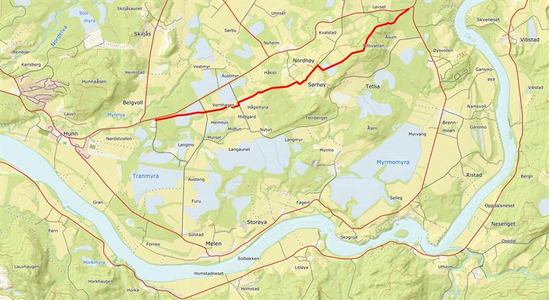 Tranmyra er et myr- og villmarksområde mellom Hunn og Ranemsletta. Her var det bureisningsfelt rundt 1930. En oldtidsveg går over myra og denne oldtidsveien er nå familievennlig tursti. Merket med "severdighet"-skilt i tre. Merket løype (blå) med avstikker til Tetliberget og til Tetlivattan (utsiktspunkt). Du kan også ta en avstikker og se gravhauger og besøke Overhallas mest sjarmerende trimboks på turen.