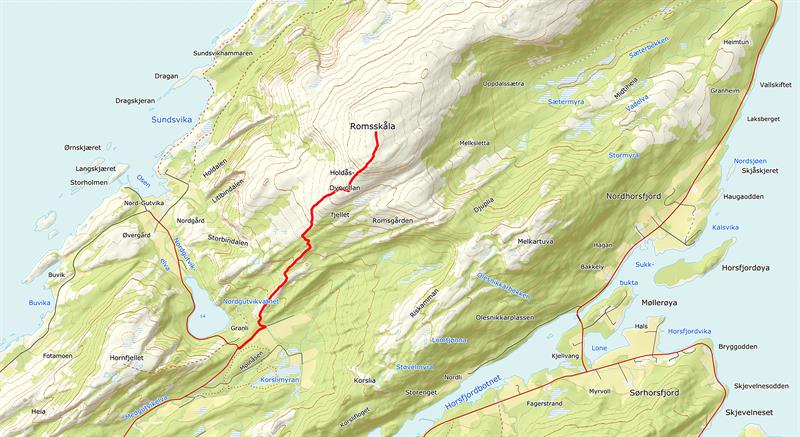 Løypa starter fra jordbruksvegen til Sønndalslia, og følger bergryggene fra Sønndalslia opp til Hol¨sfjelet og videre til Romsskåla, Løypa er merket med varder og krysser et par skogholt og en bekkedal på veien. Underlaget er fast, og landskapet åpent med god utsikt. Vær godt kledd for turen, du kan bli overrasket av havskodde.