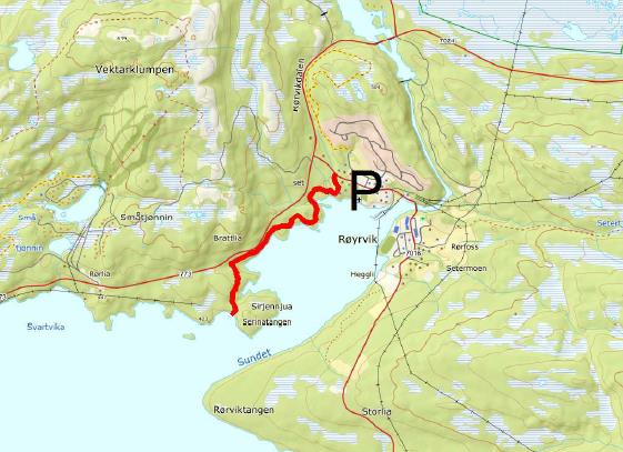 Adkomst: Fra E6 ta på Fv 773 mot Røyrvik. Turstien starter i Røyrvik sentrum ved Røyrvik Kirke / Røyrvik bygdatun.