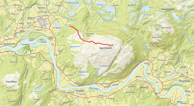 Spannfjellet er et flott turmål med nydelig utsikt over Namsen og Overhalla. På godværdager vil du få utsikt mot Høylandet og Grong fra toppen. Start turen ved parkering og følg veien mot toppen av Blakkhaugen. Følg så merket sti til Vigdisvarden (Fuglårvarden i kart). Følg stien videre til varden på toppen av Spannfjellet. Noe myr i starten, men store deler av turen er kloppet. Ca. 3,6 km en vei.