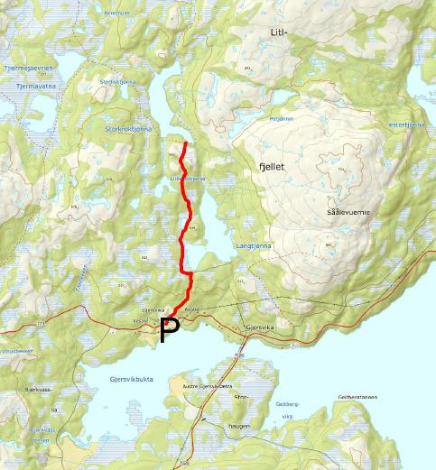 Adkomst: Fra E6 ta av mot Røyrvik på Fv 773, følg veien til tettstedet Gjersvik. Parker ved det gamle hotellet, like før krysset mot Røyrvik. Du kan også parkere på parkeringsplass mellom Gjersvik og Bjørkvatnet.