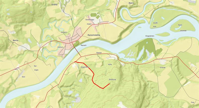 Følg FV17 fra Namsos eller Grong til Ranemsletta, ta av i rundkjøring og kjør over Ranemsletta bru. Ta til høyre. Etter 200 m ta til venstre inn på merket parkering nedenfor gård. Turen krysser gårdstun, vis hensyn. Alternativt kan man kjøre sørsiden av Namsen fra Namsos eller Grong til parkering.