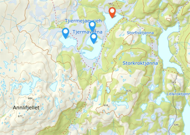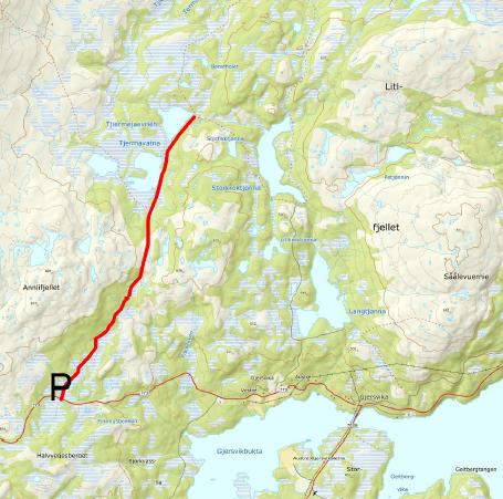 Adkomst: Fra E6 ta av mot Røyrvik på Fv 773. Parker på parkeringsplass mellom Gjersvik og Bjørkvatnet. Du kan også parkere i Gjersvik, ved det gamle hotellet ved krysset til Røyrvik. Turen vil da bli en del lengre.