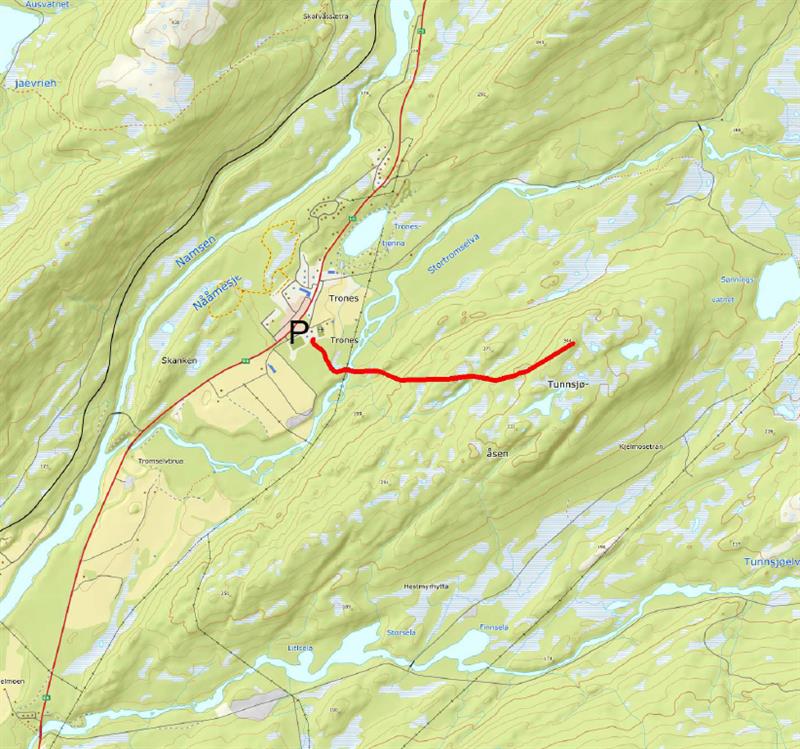 Turen opp til Tunnsjøåsen er 4 km tur-retur på godt merket sti, skiltet etter nasjonal standard. Med en stigning på ca. 200 høydemeter passer turen for både store og små. Turen starter ved Trones skole, få minutters gange fra Namsskogan Familiepark. Følg merking forbi skolen mot broen over Tromselva og Tronesfossen. Etter å ha krysset elva er det en stor gapahuk til fri benyttelse. Tunnsjøåsen er et populært turmål blant lokalbefolkningen og det er tydelig sti mot toppen der en utsikt over Trones venter. Ta gjerne med bærspann – det er rikelig med tyttebær, blåbær og multe i området.