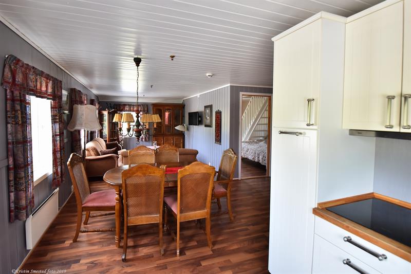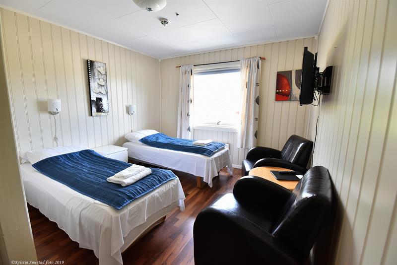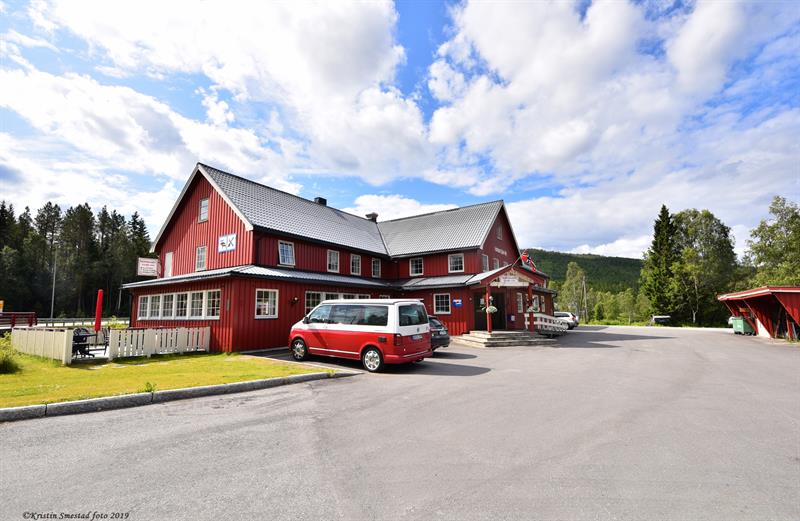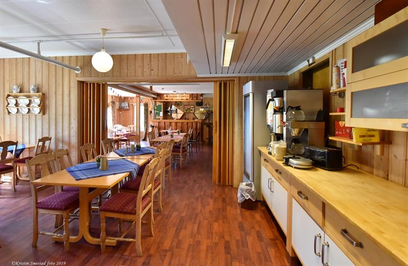 Foruten overnatting har vi matservering, TV-stue, peisestue m. bar (alle rettigheter) og et mindre møtelokale med plass til 30. Vi server hjemmelaget tradisjonelle retter, samt retter av lokale matvarer fra fisk, vilt, ost m.m. Kommer du utenfor kafeteriaens åpningstid, så ring nattvakt. Telefonnummer står på ytterdør.